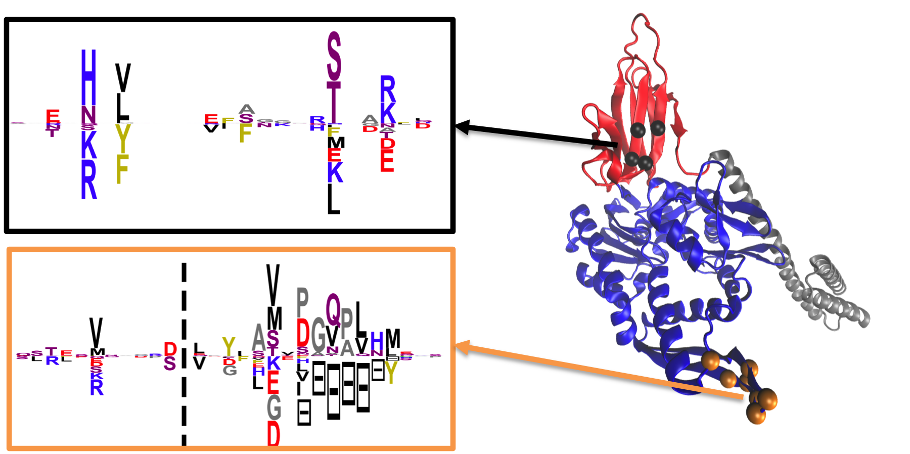 Application of Restricted Boltzmann Machines to the modeling of chaperon protein HSP70. The insets show two features inferred by the RBM from sequence data. On each site (x-axis in the inset, positions shown by balls on the protein 3D structure) the letter height indicate the relevance (positive or negative) of the corresponding amino acid to the feature; gaps are shown with squares. The top feature codes for a beta-sheet structural motif, while the bottom feature codes for the presence/absence of a loop crucial for function. Courtesy of J. Tubiana. |