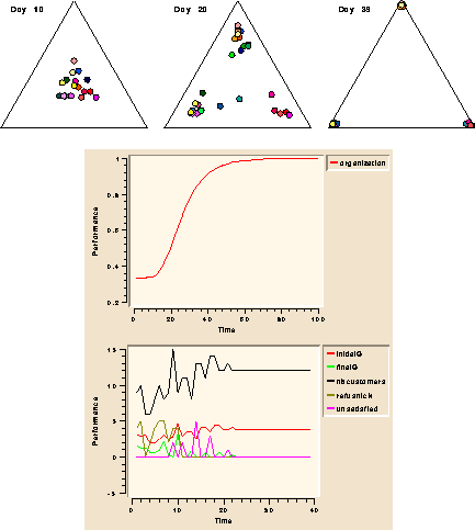 The order parameter, y, steadily increases to 1 in 200 time steps. As seen on the simplex plot at time 50, each customer has built-up fidelity to one shop. Performance of shop number one also stabilizes in time, and variations from stationarity are not observed after 20 time steps.